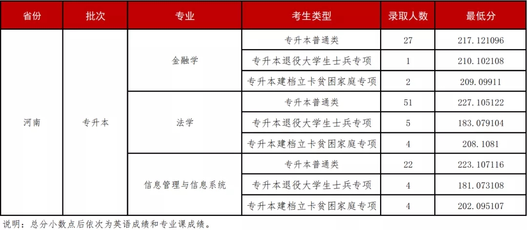 专升本建档立卡贫困家庭专项:金融学专业计划2人,投档2人,最低180.080100分;法学专业计划6人,投档6人,最低207.107100分;信息管理与信息系统专业计划8人,投档8人,最低195.093102分。