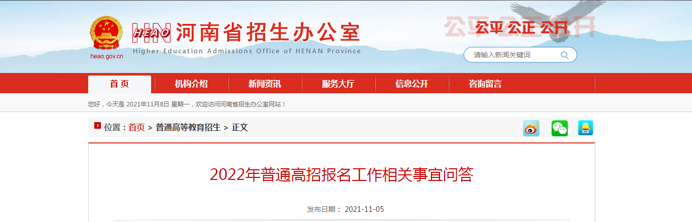 河南省招生办公室11月5日发布了2022年普通高招报名工作相关事宜问答,其中确定了2022年普通高招网上报名开始时间为2021年11月10日9:00;艺术类截止时间为11月15日17:00,非艺术类截止时间为11月25日17:00。