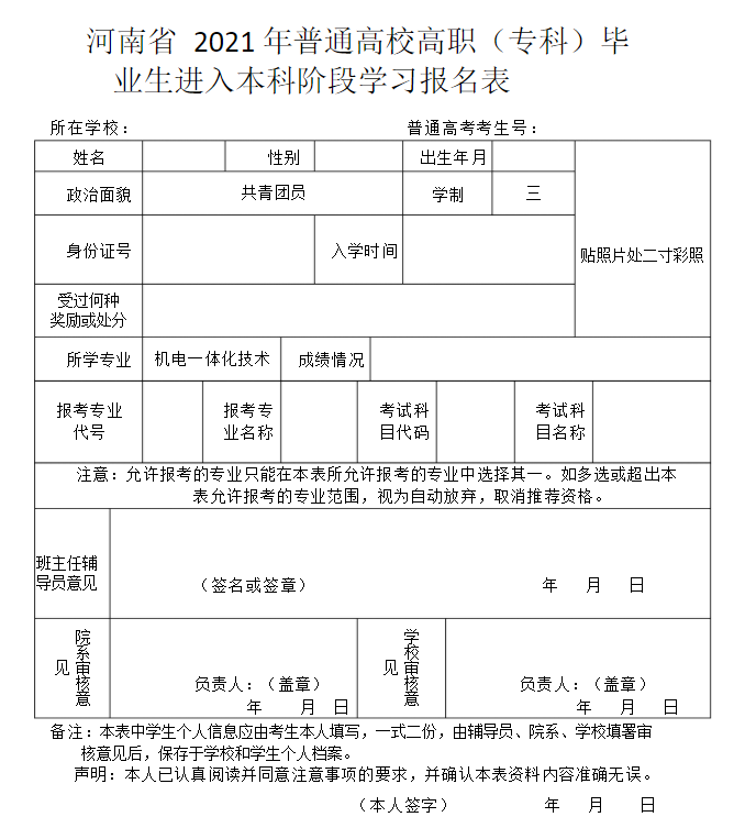 然后,院校会对每名参加专升本报名学生的基本信息、学籍信息、所学专业与报考专业对照情况、学业情况、在校表现等情况进行审核。通过审核之后,各高校会统一组织学生填写纸质报名表。(历年的报名表大致相同,河南专升本网以2021年为例)