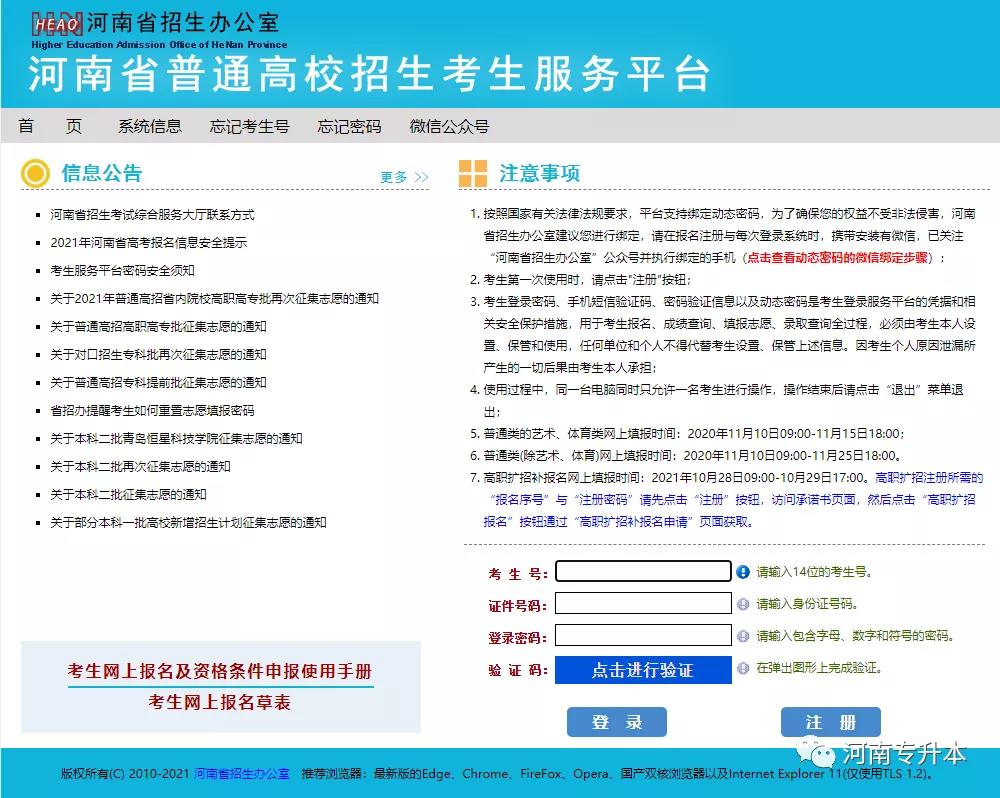 通过资格审核之后,每个专升本考生都会获得一个报名序号和注册密码,就可以登录“河南省普通高校招生考生服务平台”进行网上报名了哦(如下图所示)~