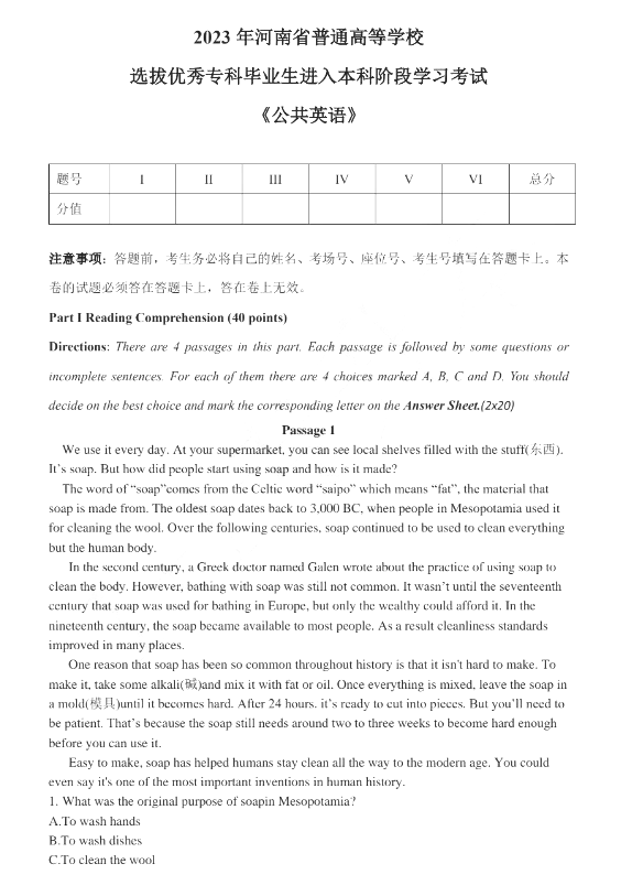 以下是河南专升本网为大家整理的2023年河南专升本公共英语真题及答案的相关资料,大家参考一下。