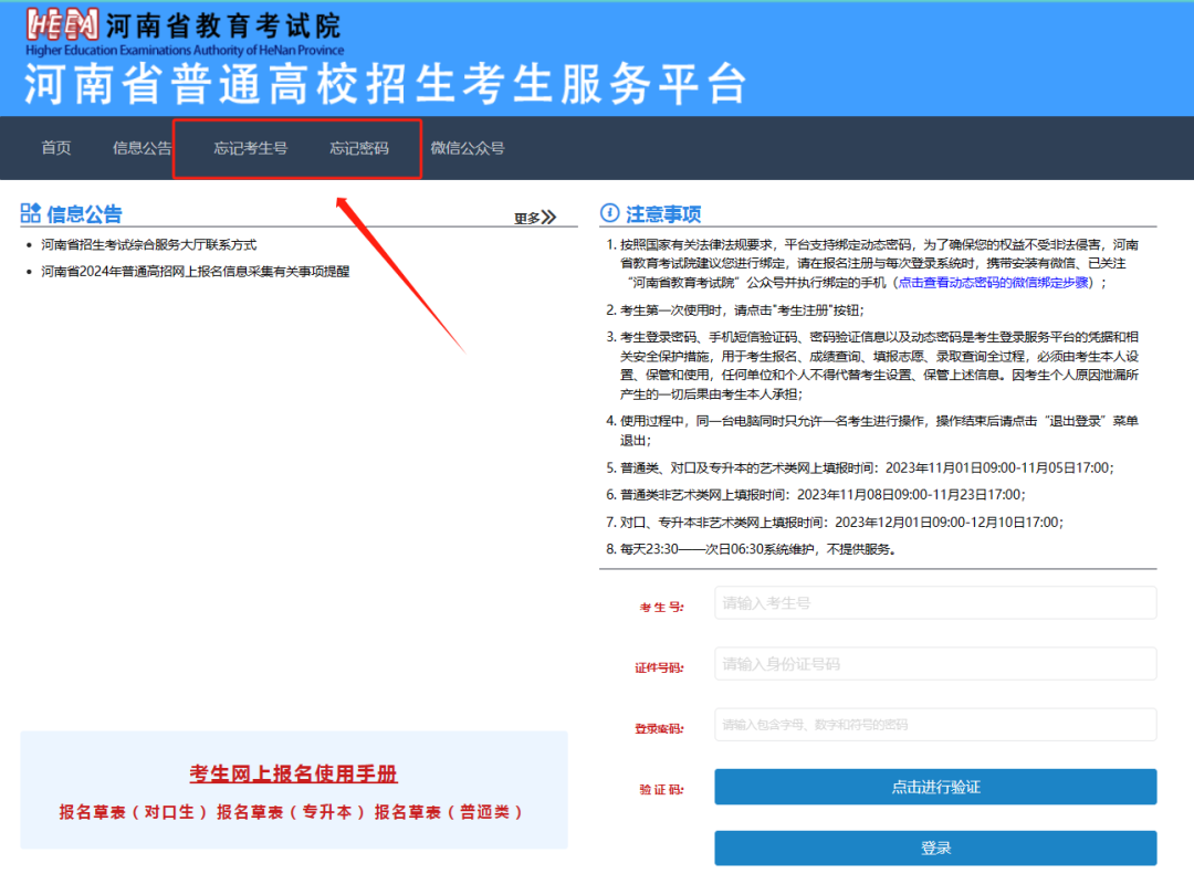 如果考生忘记自己的考生号和密码,可以通过“河南省普通高校招生考生服务平台”菜单栏的“忘记考生号”和“忘记密码”菜单项找回自己的考生号和重置密码。