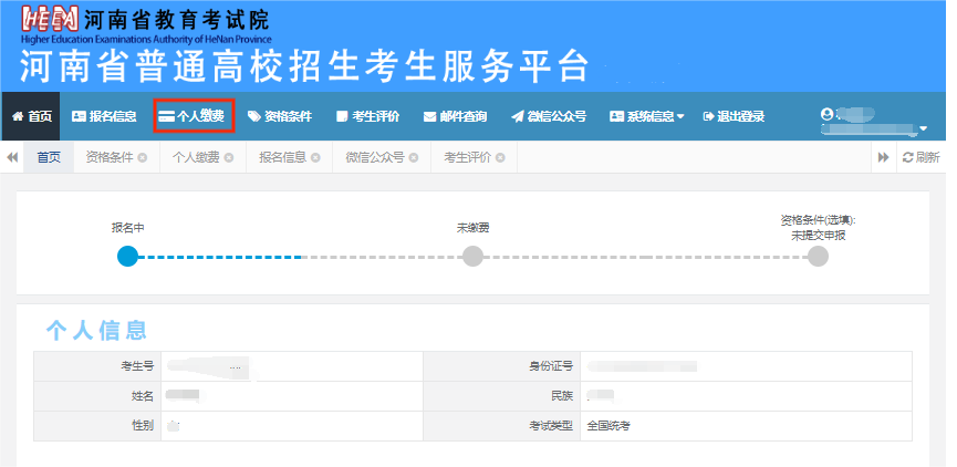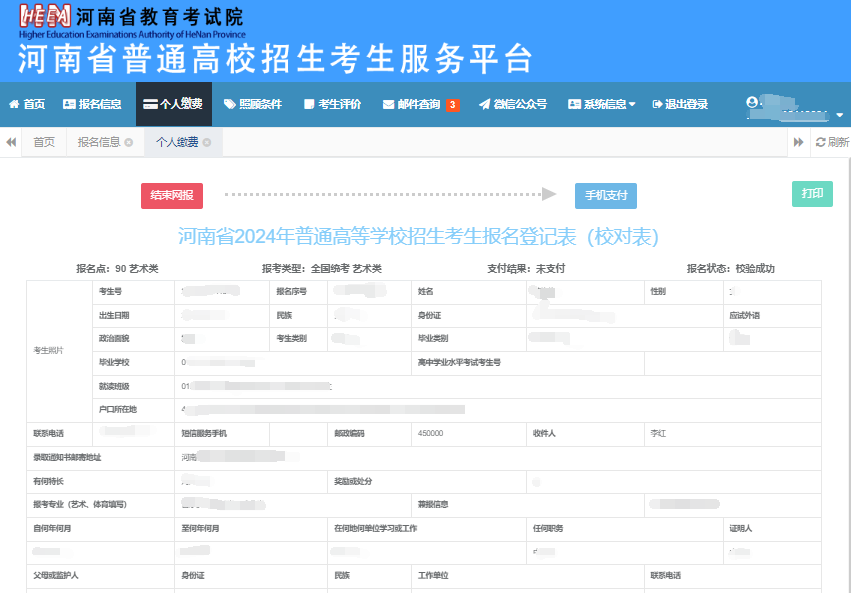 完成上述操作后,系统将跳转到首页(图2-18),此时考生选择“个人缴费”菜单项,查看“河南省2024年普通高等学校招生考试报名登记表(校对表)”(图2-19)。