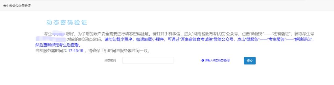 如果考生绑定了动态密码,则每次登录时,均需输入小程序显示的动态密码(图2-17)。验证时请注意手机时间和页面显示的服务器时间应一致,不要有偏差,否则可能无法正常验证通过。