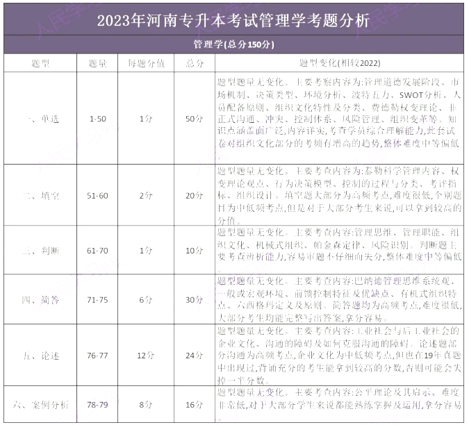 1.客观题考察方式为直接考察为主,考察学生对于基础知识掌握的熟练程度,且定义类的细节题较往年考频略有所上升。2.主观题为直接考察为主,难度为中等偏简单,较2022年考试难度下降。考点均为日常背诵手册中所涵盖的内容,主要考察学生的记忆背诵能力。3.整体而言,本次管理学考试难度适中,尤其是简答论述都是大家平时做过、练过的题目。选择题、填空题会出现个别拔高型知识。