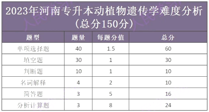 考试题型以及分值分布和去年有所变动。从题型和分值分布上来看,选择、填空、判断和名词解释这四个题目与 2022 年都是一样的,不同的是简答题减少 4 分,而分析计算题增加了4分今年的考点偏重于基础内容,可见专升本对于动植物遗传学的考察更加趋向于知识点的熟练理解,不仅限于纯粹的背诵。