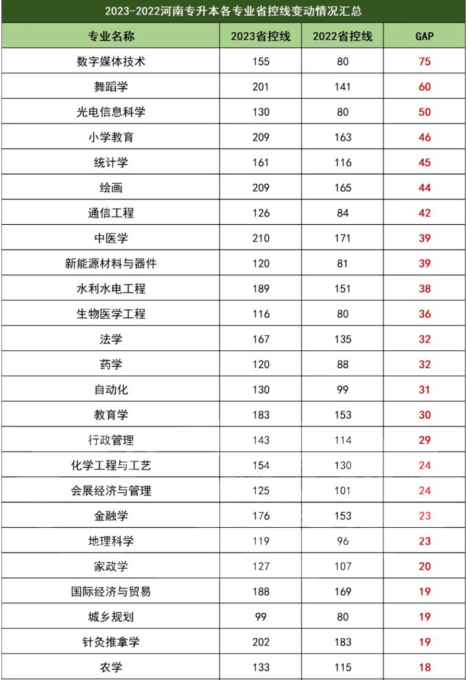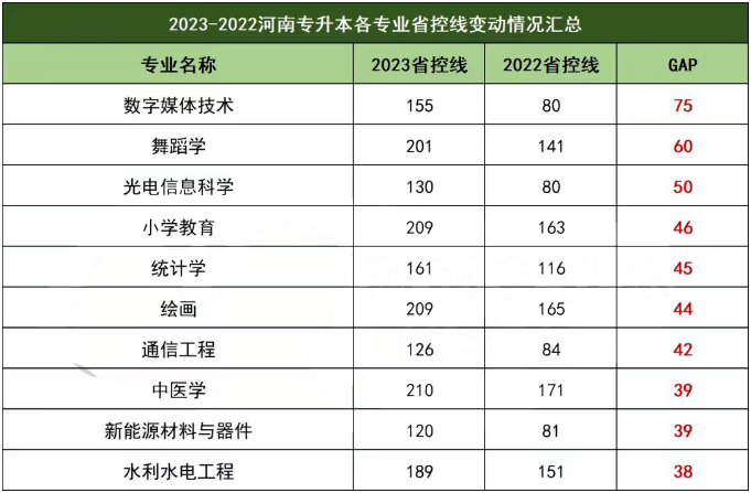 从河南专升本各专业的省控线情况来看,与2022年相比,2023年河南专升本146个本科专业中,共有60个专业的省控线成绩出现了上涨。