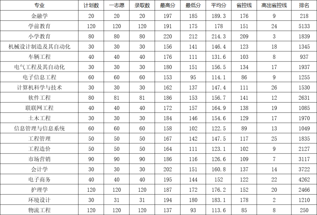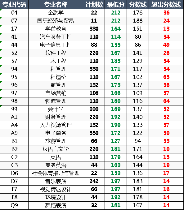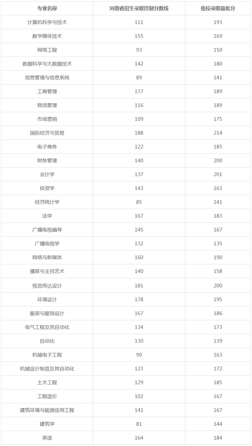 1.河南财经政法大学(公办)、2.华北水利水电大学(公办)、3.黄河交通学院(民办)、4.郑州商学院(民办)、5.商丘师范学院(公办)、6.郑州西亚斯学院(民办)、7.南阳师范学院(公办)、8.安阳师范学院(公办)、9.南阳理工学院(公办)、10.郑州升达经贸管理学院(民办)、11.河南工业大学(公办)、12.郑州航空工业管理学院(公办)、13.郑州经贸学院(民办)、14.河南工程学院(公办)、15.河南财政金融学院(公办)、16.河南工学院(公办)、17.平顶山学院(公办)、18.黄河科技学院(民办)、19.郑州工程技术学院(公办)、20.河南理工大学(公办)、21.商丘学院(民办)、22.河南科技学院(公办)、23.商丘工学院(民办)、24.郑州科技学院(民办)、25.新乡工程学院(民办)、26.安阳工学院(公办)、27.信阳农林学院(公办)、28.河南城建学院(公办)、29.黄淮学院(公办)
