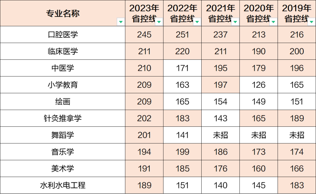 标黄部分为当年省控线排名前10的专业,可以看出口腔医学、临床医学、中医学、针灸推拿学、音乐学、美术学分数线一直都比较高,整体集中在艺术类及医学类;