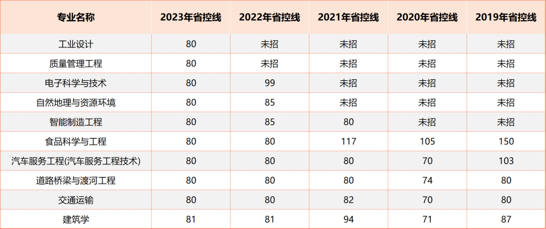 可以看到,这10个专业2023年省控线都仅有80分左右,在对比近几年省控线后不难发现,除了食品科学与工程,但其他专业的省控线都比较稳定,预计24年的分数基本不会有太大波动。