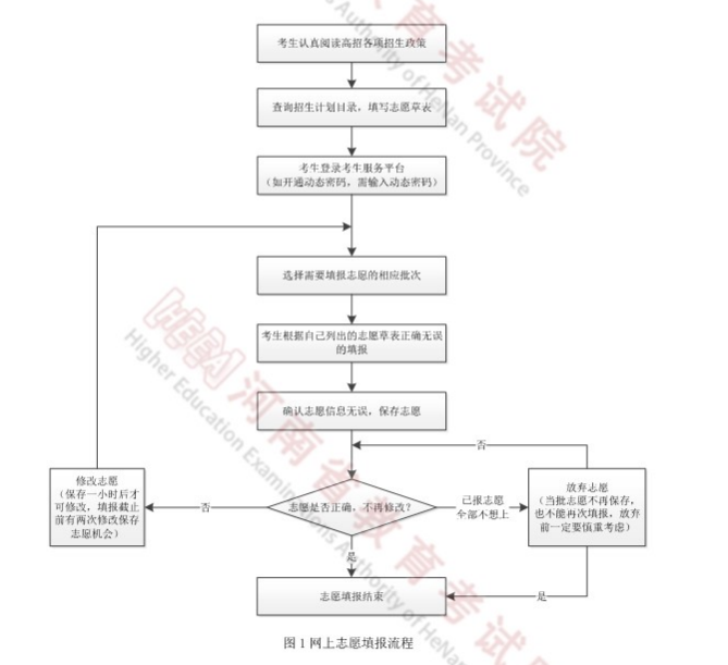 考生志愿保存一小时后方可修改志愿,在该批志愿填报截止时间前有两次修改并保存志愿的机会。下图为网上志愿填报的流程:
