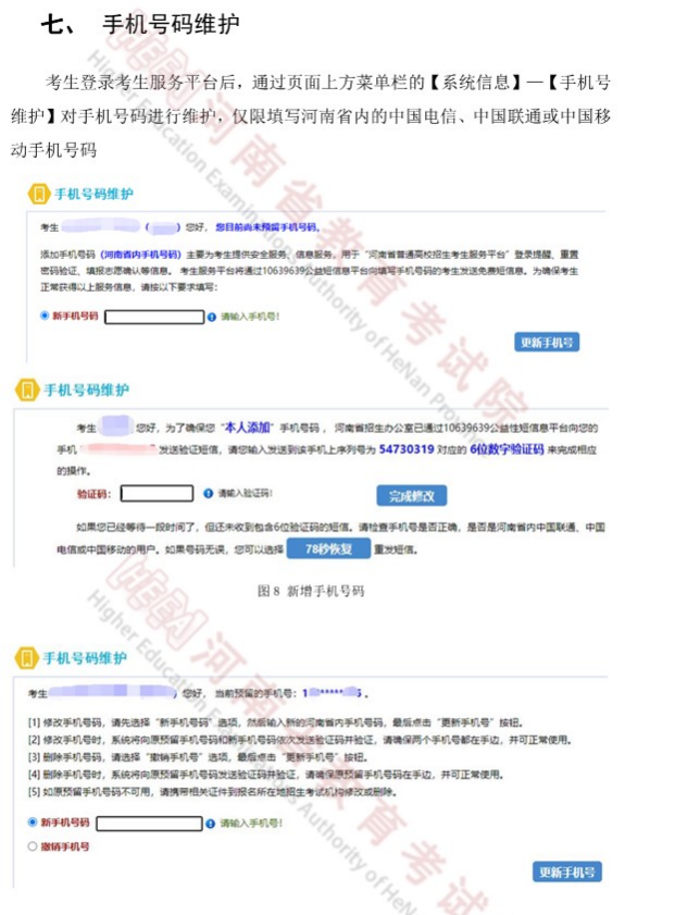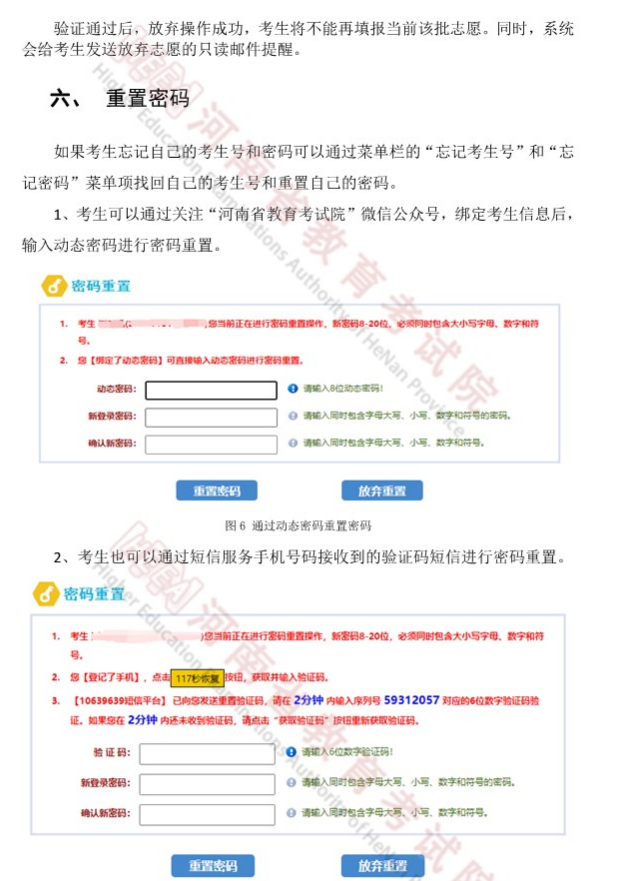 1、考生一定要保存好自己的考生号和密码,以免因考生号和密码丢失或泄漏造成不必要的麻烦,请认真阅读考生服务平台首页的“考生服务平台密码安全须知”。为了确保考生账户的安全,建议尚未绑定手机号或关注官微并绑定考生号的考生抓紧绑定。如忘记密码,可以通过考生服务平台首页的“忘记密码”选项自行重置密码。如确实无法自行重置,请考生本人持准考证和身份证到报名所在地基层招生考试机构重置密码。