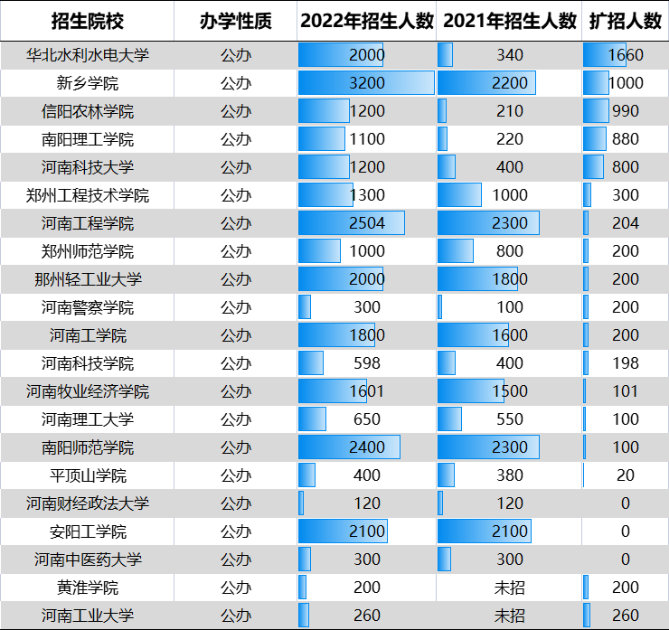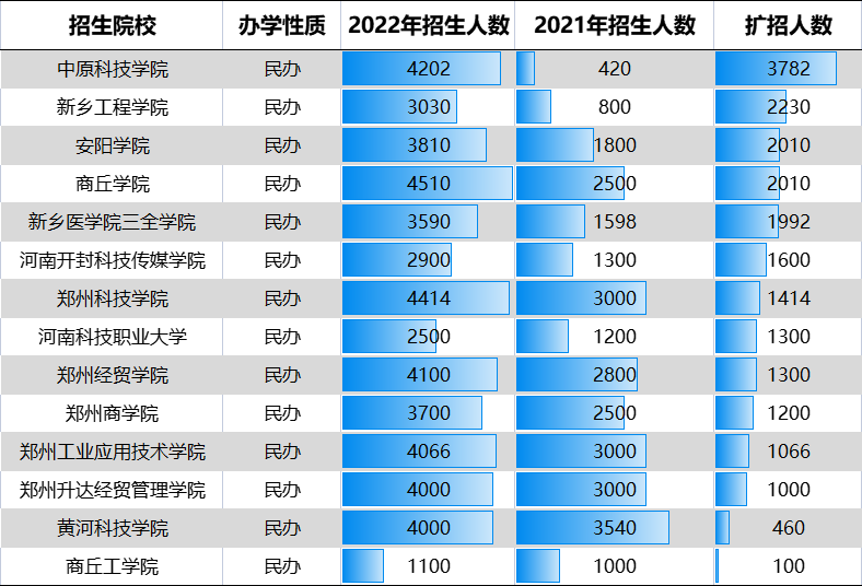 从表中我们不难发现,其中中原科技学院扩招最多,高达3782人,河南财经政法大学、安阳工学院、河南中医药大学保持不变。