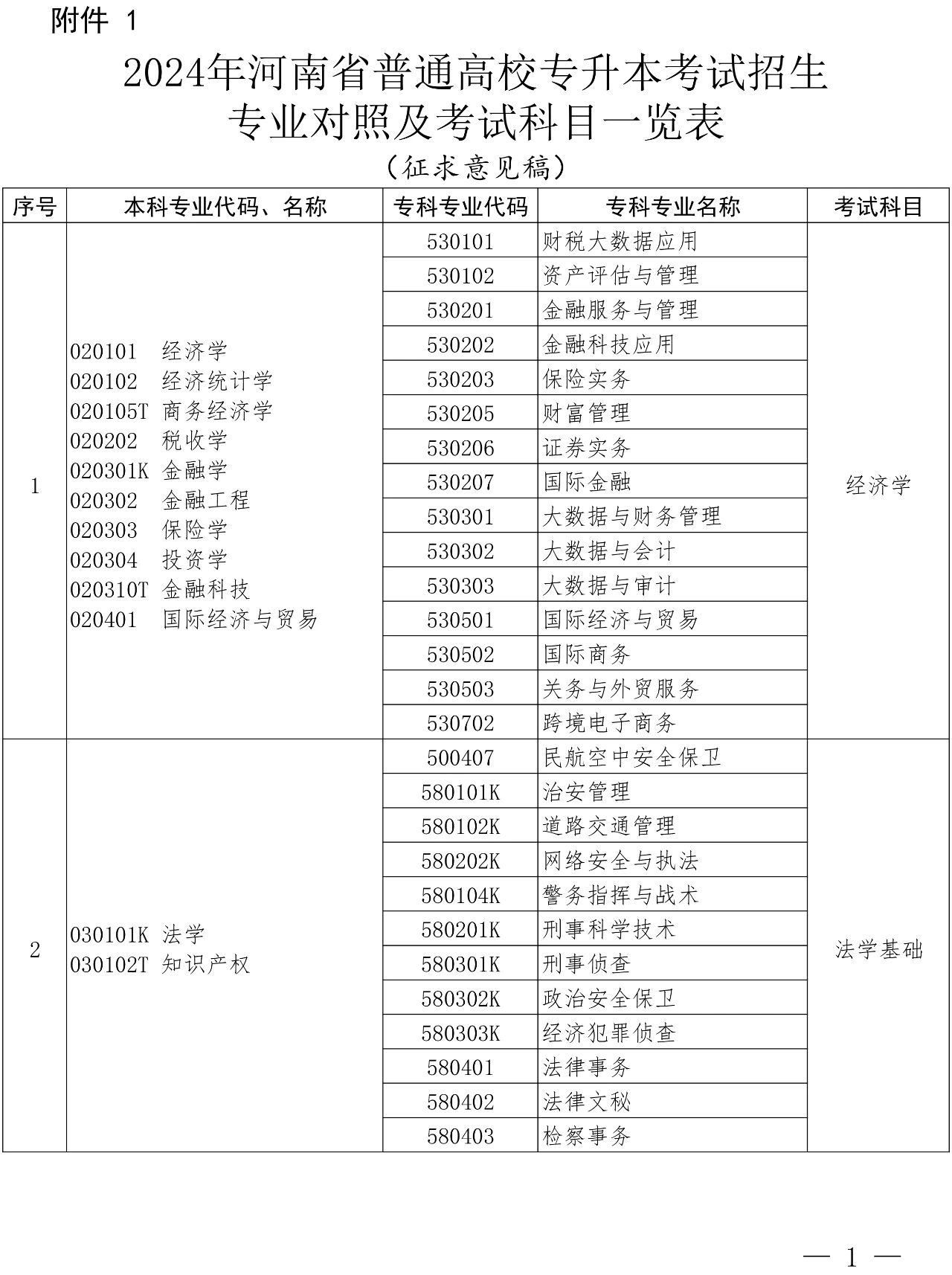 为好2024年普通高等学校专升本考试招生工作,现将《2024年河南省普通高校专升本考试招生专业对照及考试科目一览表(征求意见稿)》(附件1.以下简称《征求意见稿》)发给各教学院,请根据各专升本招生具体情况,对征求意见稿认真进行核对,充分发表意见和建议。具体要求如下: